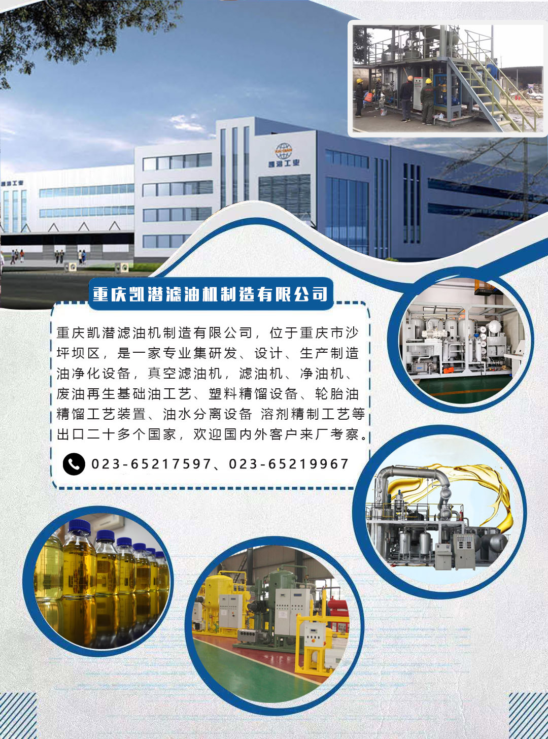 重慶凱潛濾油機(jī)制造有限公司,位于重慶市沙坪壩區(qū),是一家專業(yè)集研發(fā)、設(shè)計(jì)、生產(chǎn)制造:廢機(jī)油蒸餾基礎(chǔ)油、基礎(chǔ)油溶劑萃取設(shè)備、廢油減壓蒸餾基礎(chǔ)油成套裝置設(shè)備、廢機(jī)油蒸餾基礎(chǔ)油、基礎(chǔ)油溶劑萃取設(shè)備、廢油減壓蒸餾基礎(chǔ)油成套裝置設(shè)備、廢油提煉汽柴油裝置、塑料柴油精制、輪胎柴油精制、濾油機(jī)、真空濾油機(jī)、變壓器油濾油機(jī)、出口濾油機(jī)設(shè)備為一體的企業(yè)。
