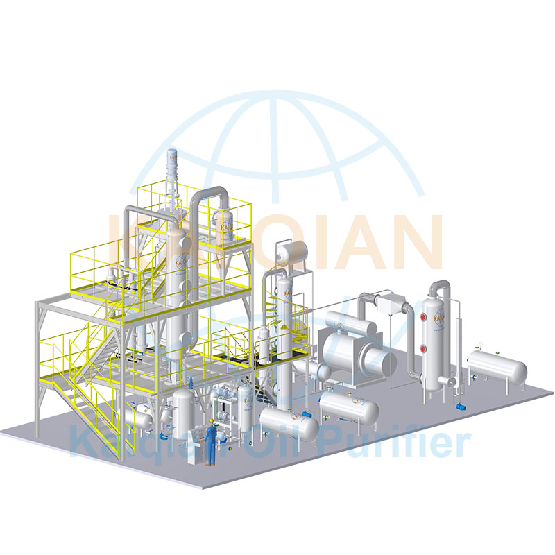 以廢舊輪胎、廢舊塑料熱裂解處理的固體垃圾回收油品再利用的技術,已經(jīng)在世界范圍內(nèi)得到快速推廣,不但消除了部分固體白色垃圾對環(huán)境的污染,而且實現(xiàn)了能源的再生利用,但是廢輪胎、廢塑料熱裂解后的毛油,大部分應用是作為熱能燃料。因裂解過程中會產(chǎn)生炭黑,炭黑隨著油氣進入冷凝系統(tǒng),故油品顏色較黑,雜質較多,且熱值不高,利用率較低;而少數(shù)采用簡單脫色沙對油品進行簡易處理,此技術處理精度較低,加工過程中油品損失嚴重,而且脫色沙過后的油品化學性質不穩(wěn)定,極容易被氧化,造成油品顏色變黑,雜質多,經(jīng)濟效益損失較大,可采用高真空精餾設備裝置對塑料輪胎毛油精煉提純得到更清潔透明的燃料油。