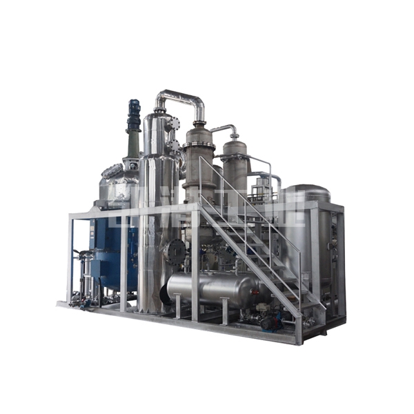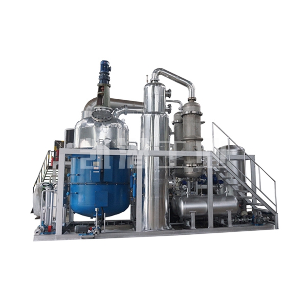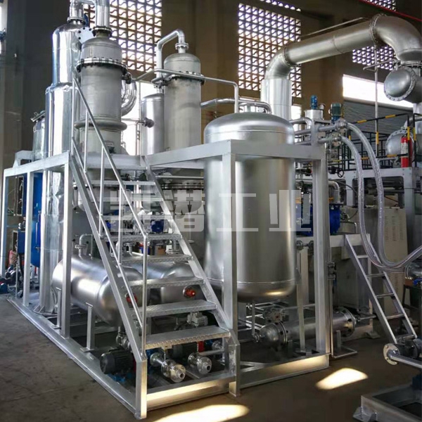 廢油脫色提煉設(shè)備工藝采用國內(nèi)先進的減壓薄膜分子閃蒸技術(shù),高真空條件(jue對壓力10Pa)下可在較低溫度下將高粘度組分的潤滑油蒸餾出來,同時也降低高溫裂解、聚合、設(shè)備堵塞等問題的發(fā)生。無酸渣、廢酸、廢水等二次污染物的產(chǎn)生,是一種清潔、環(huán)保、投資適當(dāng)的凈化工藝。